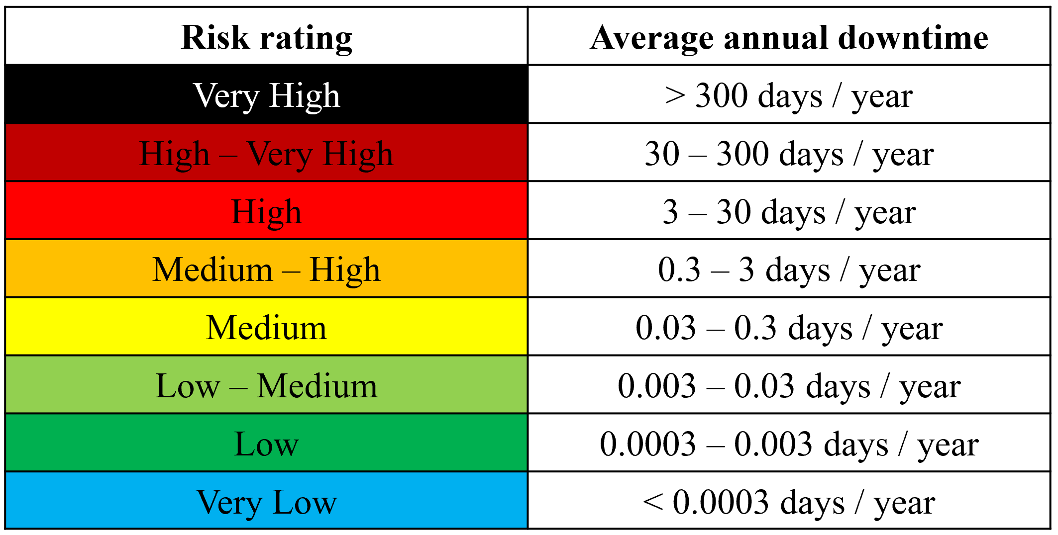 For a risk averse client, the standard risk matrices have ratings that are one “level” higher than for a risk neutral client. Conversely, for a risk neutral client, the standard risk matrices have risk ratings that are one level lower than for a risk neutral client. A typical example of a risk averse client is a data center client, who may be risk averse to downtime because reliability of their assets is critical to their business. To demonstrate what risk averse and risk neutral risk matrices look like, the standard risk matrices for downtime for a risk averse client and for a risk neutral client are shown below.