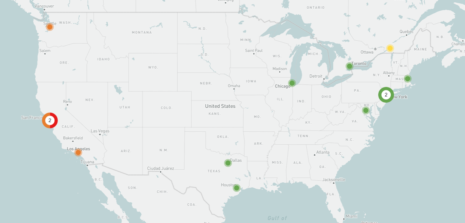 Figure 13. Summary of seismic risk ratings assigned for Arup offices in the United States and Canada. Image is from Iris. Green indicates Low risk, Yellow indicates Medium risk, Orange indicates Medium-High risk, and Red indicates High risk.